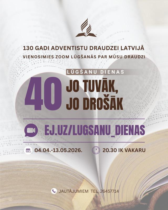 Šis ir īpašs laiks mūsu draudzes dzīvē - 14. maijā apritēs tieši 130 gadi kopš tika dibināta pirmā adventistu draudze Latvijā. Ar pateicību Dievam par Viņa vadību cauri gadiem un ar ilgošanos pēc jaunas atmodas, aicinām vienoties 40 lūgšanu dienās par mūsu draudzi un tās kalpošanu šajā jubilejas gadā.