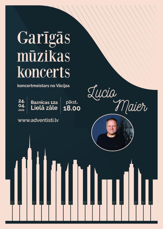 Esi mīļi gaidīts garīgās mūzikas koncertā 24. aprīlī, plkst. 18.00, Baznīcas ielas 12a Lielajā zālē! Tiks atskaņoti garīgu un pazīstamu dziesmu aranžējumi. Uzstāsies mūzikas referents un koncertmeistars Lucio Maier (Vācija).